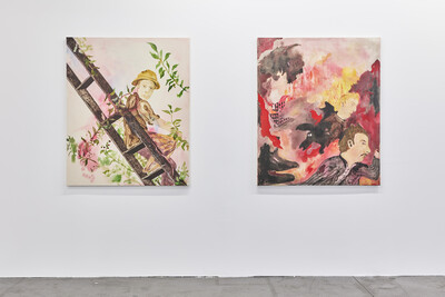 Over the last year Kamps has come to incorporate imagery from various traditional regional garments and costumes, evoking the performativity of theaters, circuses, or carnival events. Her figures, especially children, demonstrate cultural belonging through dress. Be it a Bavarian boy’s traditional garments, the artist’s childhood ballet dancing garb, or the archetypal American cowboy attire, a costume communicates societal background and identity, acting as a signifier of cultural affiliation. These signifiers on the societal stage, reflecting nationalism and the creation of shared myth, are juxtaposed with scenes deriving from actual stages, related to conventional performativity, like circus performers, clowns, or carnival costumes.