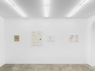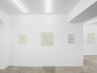 Les pensées du coeur (“The thoughts of the heart”), takes narrative as its point of departure, building on a feminist epistemology for which what is at stake is to consider the experience as a resource to generate knowledge(5). Understood as a time of resonance rather than a direct lineage, the exhibition brings togethers Leonilson’s works from 1981 to 1991 and more recent pieces by Sequoia Scavullo (b. 1995). Reflections on nonverbal communication lie at the core of Scavullo’s paintings and films. In her canvases, she constructs a symbolic alphabet – a new language founded on emotional transmission. With paternal roots in the Taíno people of the Carribean, Scavullo integrates Taíno dream-interpretation practices and their holistic worldview, conceiving of dreaming, imagination, and personal narrative as vital tools of healing and resistance. At Sans titre, her artworks unfold as new spaces of self-invention, to exit the male gaze while resonating with Leonilson’s own homoerotic perspective. In her film Ruler of the Land, Scavullo creates a narrative that blurs the line between reality and fiction, adopting a female gaze in which the artist – or perhaps her alter ego – bewitches the man fated to become her partner. Throughout the exhibition, there is an emphasis on skin: from spotted animal pelts to imagined portraits suggesting that feline markings can hint at alternative geographical and spiritual identities. Scavullo’s Dear Mr. President (2025) fuses Alan Turing’s concept of morphogenesis with notions of self-determination through coded symbols. Patterns reminiscent of feline fur appear alongside her secret alphabet, whispering a hidden message through painting.